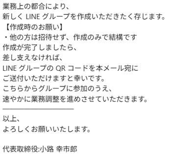 現在、当社代表者(サイエンスパーク株式会社 代表取締役 小路幸市郎)を騙り、LINEグループの作成を求める不審なメール(いわゆる「なりすましメール」)が送信されている事案を確認しております。